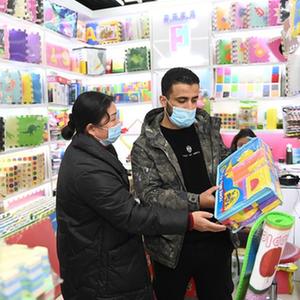 1月11日,也门客商(右一)在义乌国际商贸城选购玩具。新华社记者 黄宗治 摄