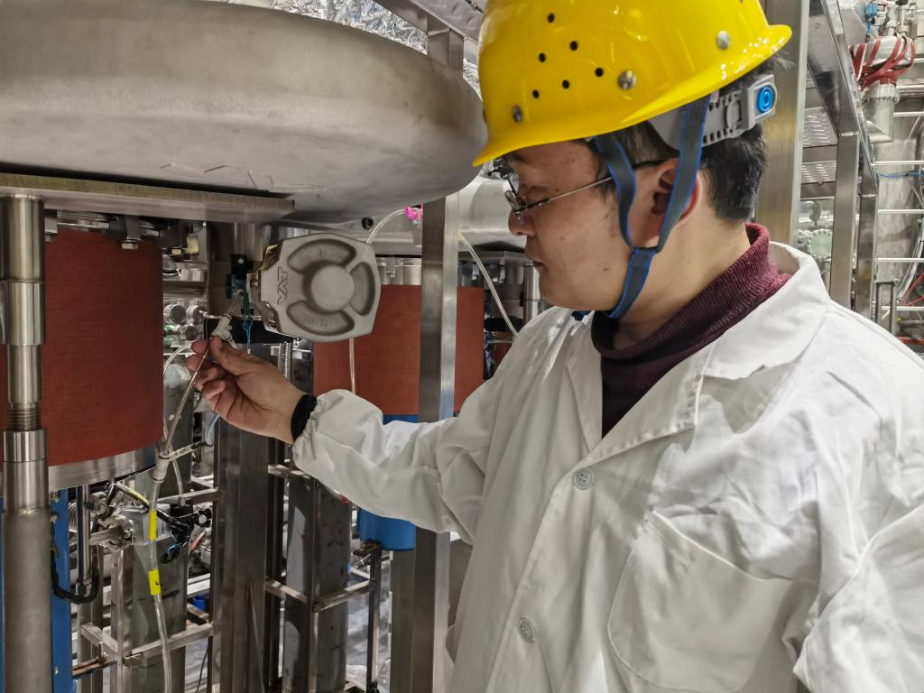 左桂忠正在检查真空设备。(新华社记者陈诺 摄)