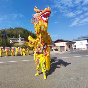一大早,江西省全南县雅溪古村,村民们聚在村广场。“龙来咯!”锣鼓声伴随着阵阵欢呼,20余名身穿亮黄色衣裳、系大红腰带的汉子手举竹竿,舞着两条威风凛凛的“金龙”从人群中穿过,围观群众阵阵叫好。