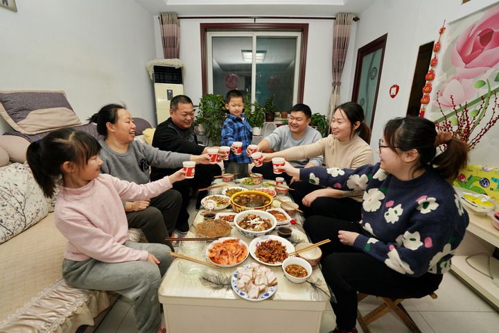 ↑1月21日,河北邢台经济开发区春蕾花园居民张康(右三)一家在吃年夜饭。 新华社记者 牟宇 摄