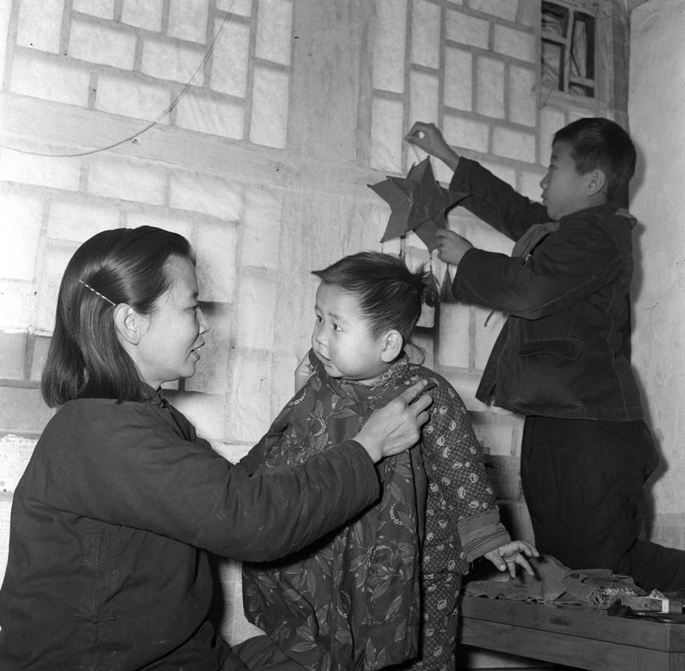 ↑1958年,北京市民何女士用买来的花布给孩子做衣服,准备过年。