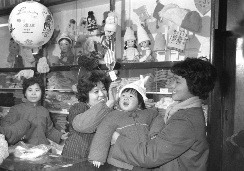 ↑1979年,市民在上海南京路向阳儿童用品商店柜台前挑选春节礼物。