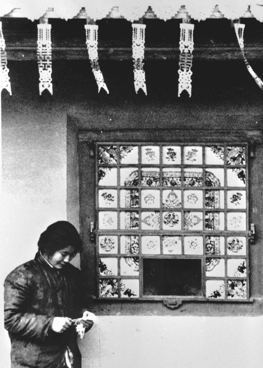 ↑1996年,甘肃省通渭县的一名妇女在剪窗花、装点居室。