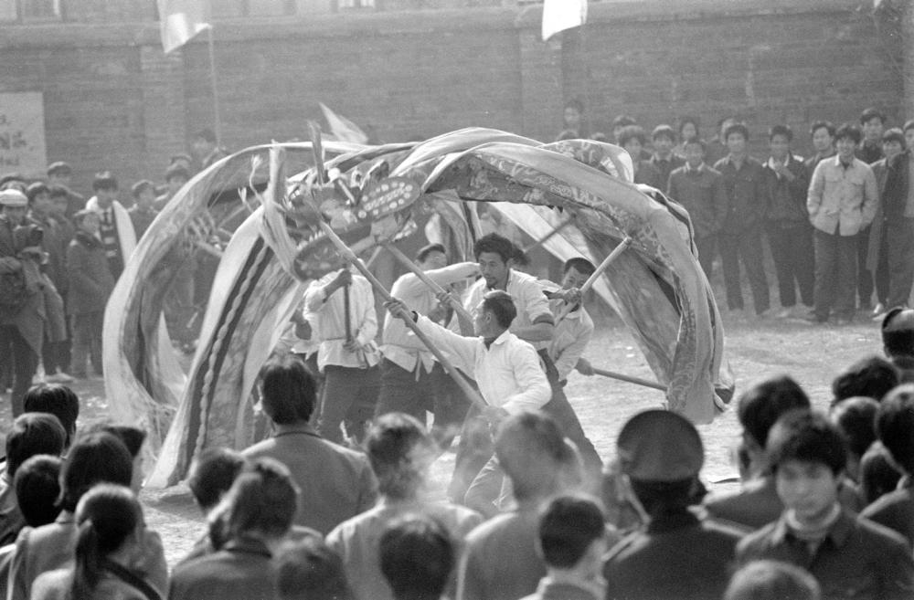 ↑1990年,湖南省临澧县的农民龙灯队在舞龙灯。