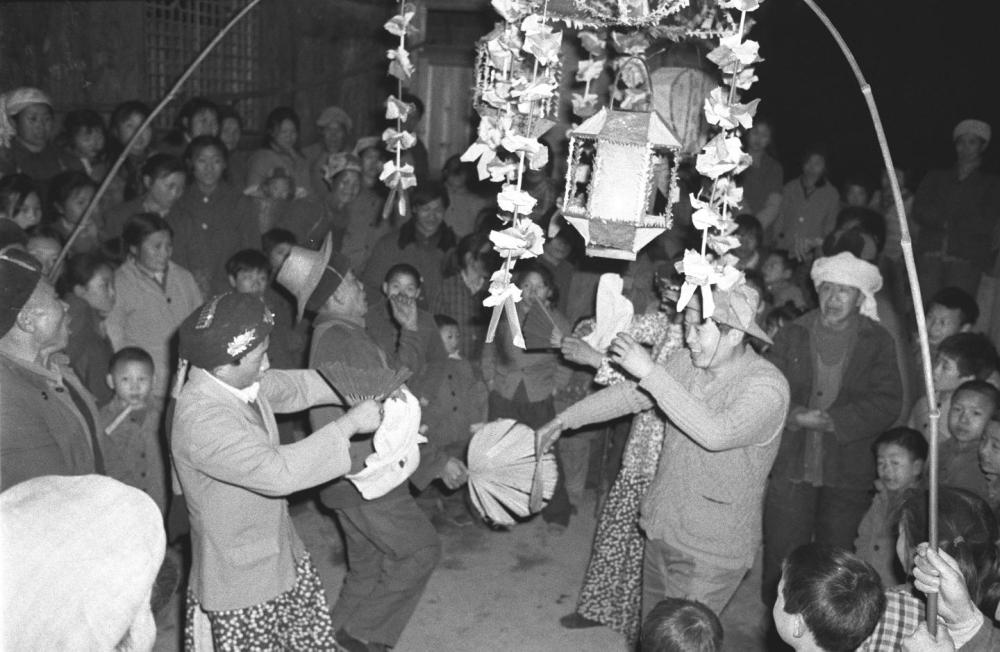 ↑1988年,四川土家族民众在观看跳花灯。正月里挨门逐户跳花灯,是四川土家族特有的民俗风情。