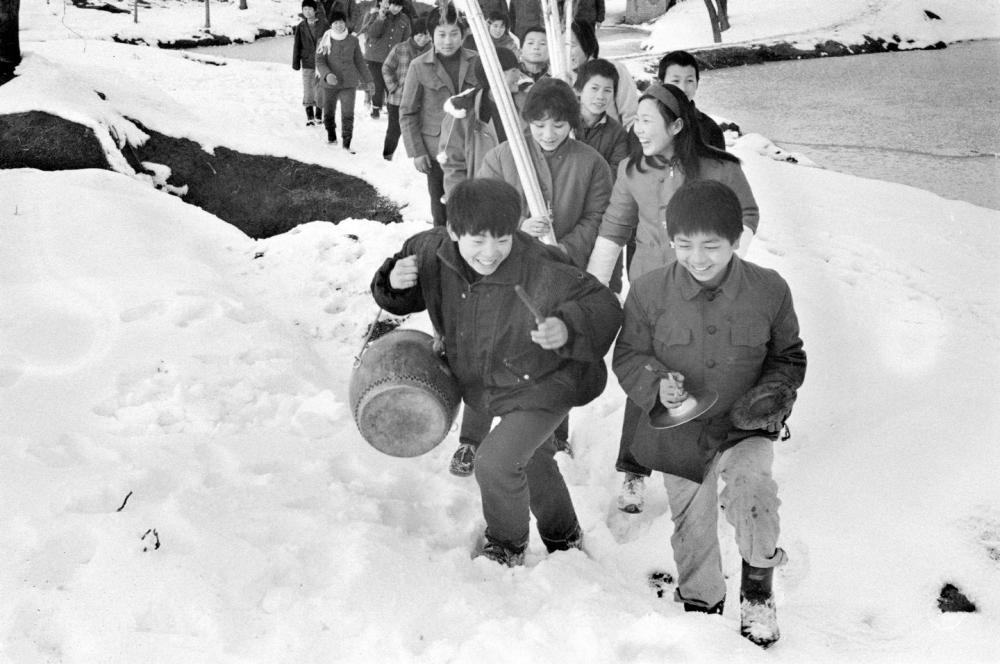 ↑1993年,安徽省阜南县王堰镇卢楼村艺校的小演员们踏着积雪去演出。