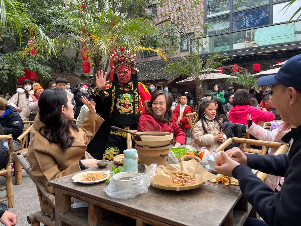 春节期间,重庆市渝中区山城巷中,“山城坝坝”茶馆的院坝内坐满了客人。人们一边围炉煮茶,一边欣赏台上的传统艺术表演,川剧变脸演员刹那间切换脸谱,赢得满堂喝彩。老板舒蓉热情招呼着客人,将茶水、点心端到桌上,忙得不亦乐乎。“今年春节的客流量远超预期,营业额是去年同期的七八倍。”
