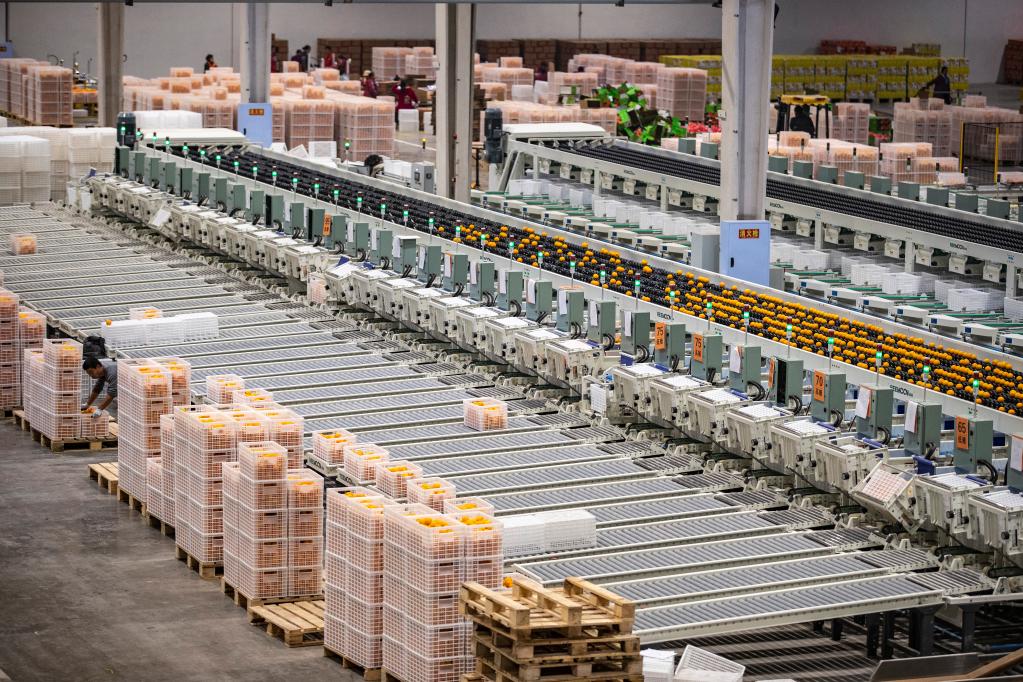 1月6日,在中国三峡柑橘(奉节脐橙)交易中心,全自动分拣线将脐橙自动分拣装筐。新华社记者黄伟 摄