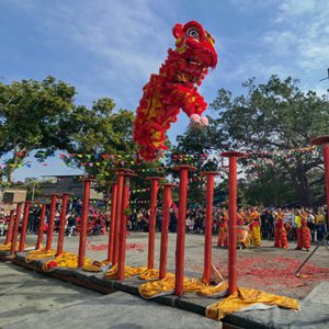 几个欢天喜地的互动节目过后,压台戏登场。由两位舞狮人扮演的雄狮纵身一跃,跳上高耸的狮桩阵。这组高桩由21个桩柱组成,桩面直径为38厘米,桩柱高在1.2米到2.5米之间,两桩之间最大跨度为1.8米。