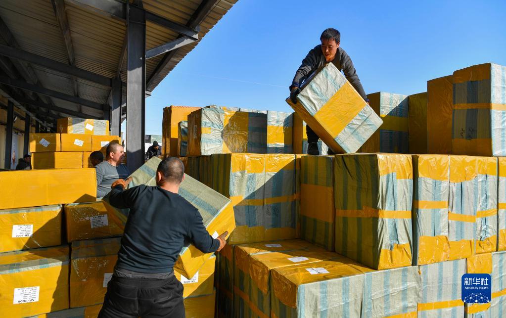 工人在新疆塔城地区一家外贸企业货场搬运即将出口哈萨克斯坦的百货(2月4日摄)。