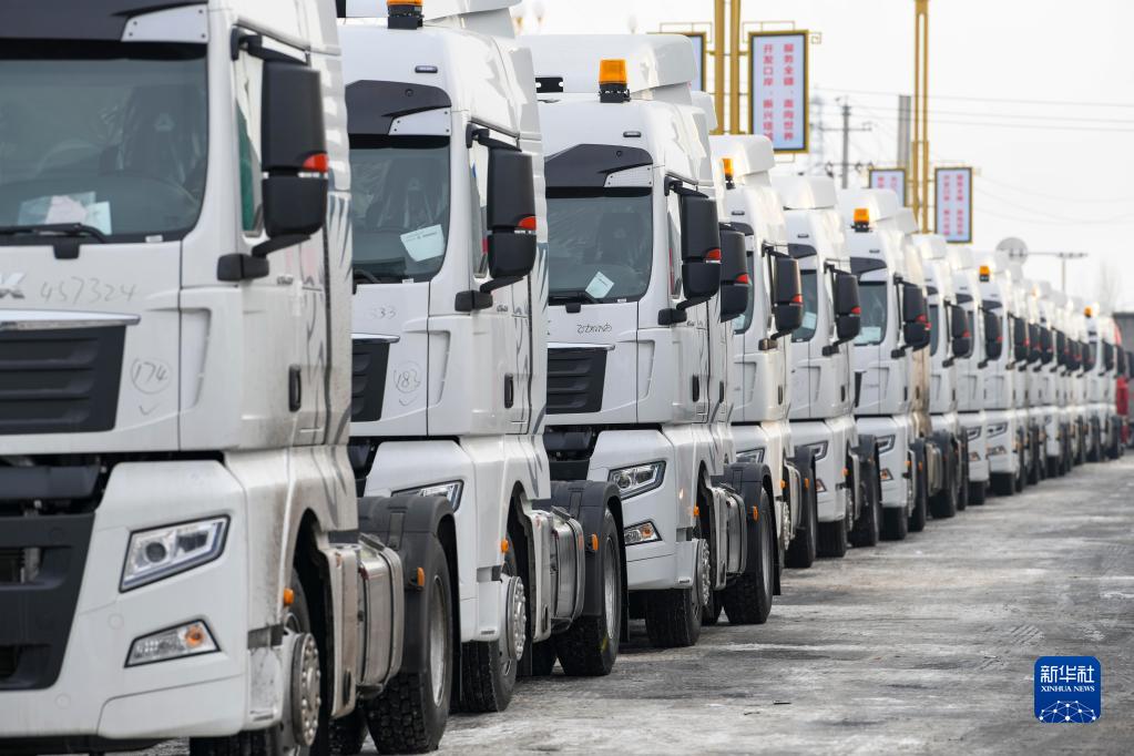出口中亚国家的卡车在巴克图口岸等候出境(2月4日摄)。