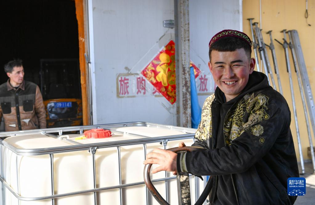 工人在新疆塔城地区一家外贸企业货场搬运即将出口哈萨克斯坦的密封漆(2月4日摄)。