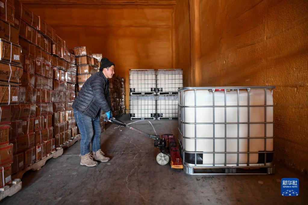 工人在新疆塔城地区一家外贸企业货场搬运即将出口哈萨克斯坦的密封漆(2月4日摄)。