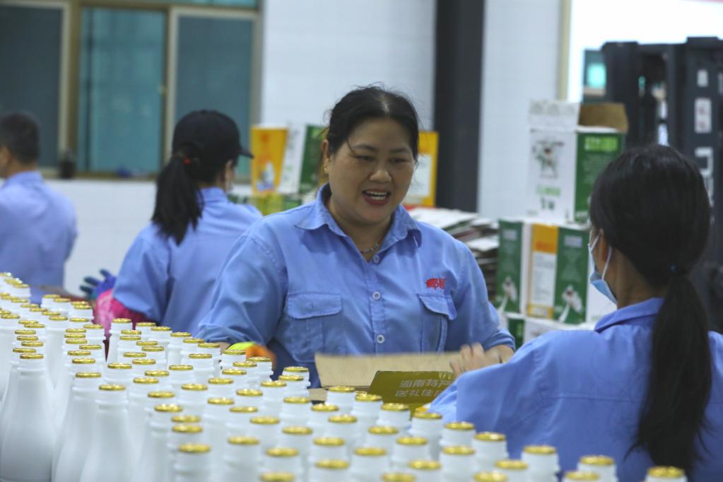 工人在椰汁饮品生产线上忙碌。(黎多江 摄)