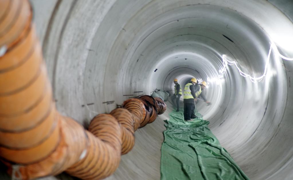 班前讲话结束后,工人们整理安全帽,戴上手套,顺楼梯走下竖井开始作业。13标段主要负责在埋深约20米的地下进行管道铺设。由于工程要穿过沙层、富水层,施工条件较为复杂,工人们需要仔细检查、清理已铺设好的管道,同时对各项设备进行调试,确保施工高效安全。