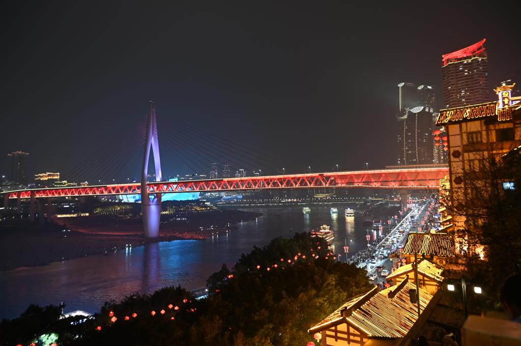 2月8日晚,从重庆市渝中区戴家巷崖壁步道望去,千厮门嘉陵江大桥灯火璀璨。新华社记者赵佳乐 摄