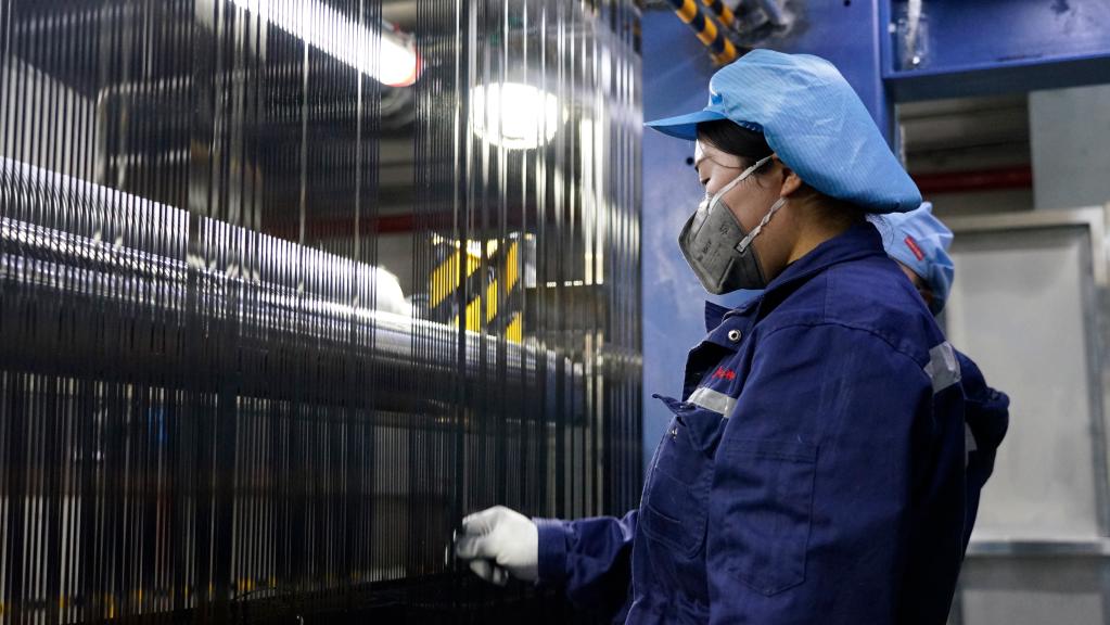 2月8日,在中复神鹰碳纤维西宁有限公司,工作人员正在检查产品。新华社记者 陈杰 摄