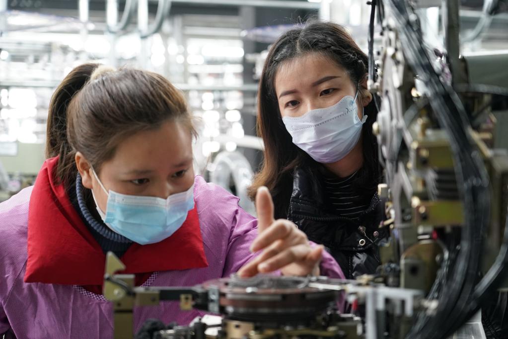 2月9日,在陕西省旬阳市智能科创产业园新开工的纺织工贸企业车间内,工人在学习操作织袜机。新华社记者邵瑞 摄