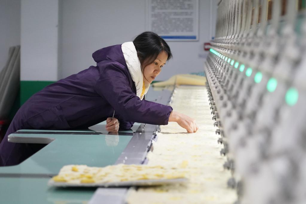 轰鸣的流水线前,44岁的新员工朱小珍正跟着师傅学习绣花,动作生疏却一板一眼,忙得头也不抬。“春节后看到这里招人我就来了。早上送完孩子来上班,活儿不重,也有师傅带,我肯定能做好!”