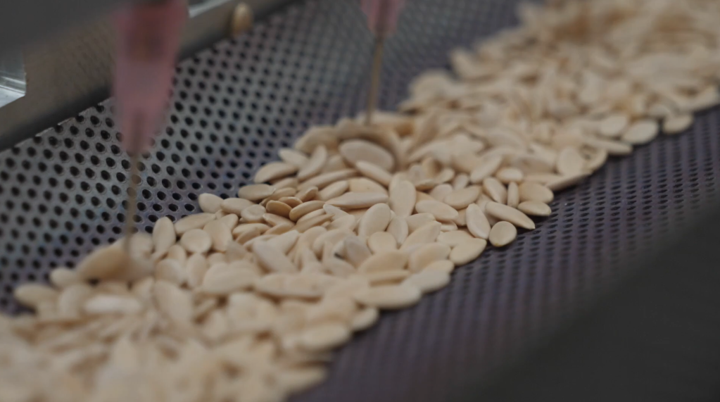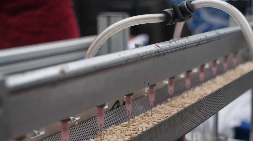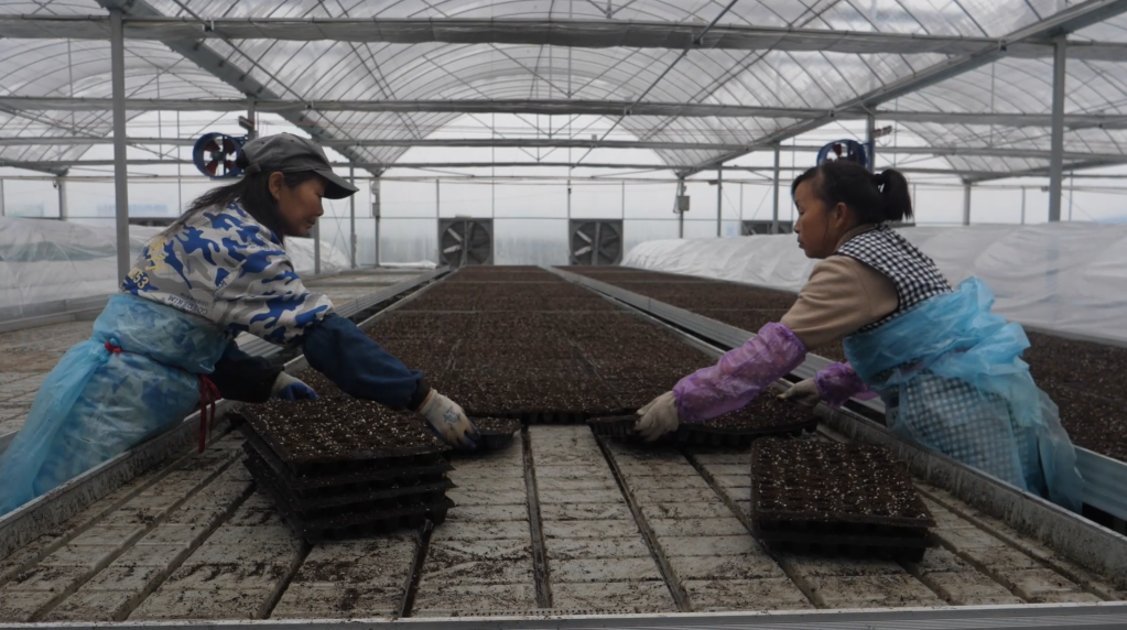 在湖南省常德市鼎城区国家现代农业产业园一处智能蔬菜育苗基地里,全自动播种机正快速运转,甜瓜种子准确地落在育秧盘中。工作人员将育秧盘整齐放置在智能温控棚里,做好集中育秧准备。