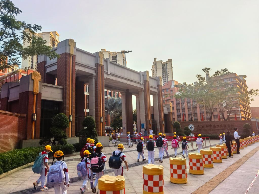 图为人大附中海口实验学校的小学生迎着朝阳走进校园。新华社记者 赵叶苹 摄
