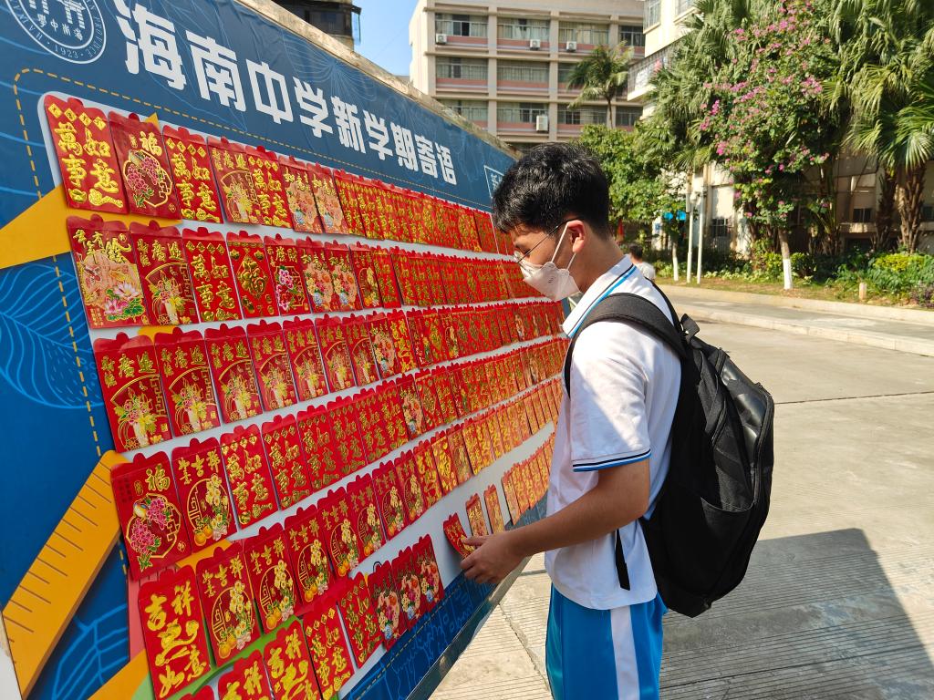 海南中学初中部在校门口布设了醒目的“寄语墙”和“红包墙”,同学们纷纷在“寄语墙”上写下新学期的目标;摘取写满祝福语的新春“红包”。“开学第一天就收到别样的祝福,很开心,相信新学期能有新的突破。”海南中学初一学生王艺霏说。