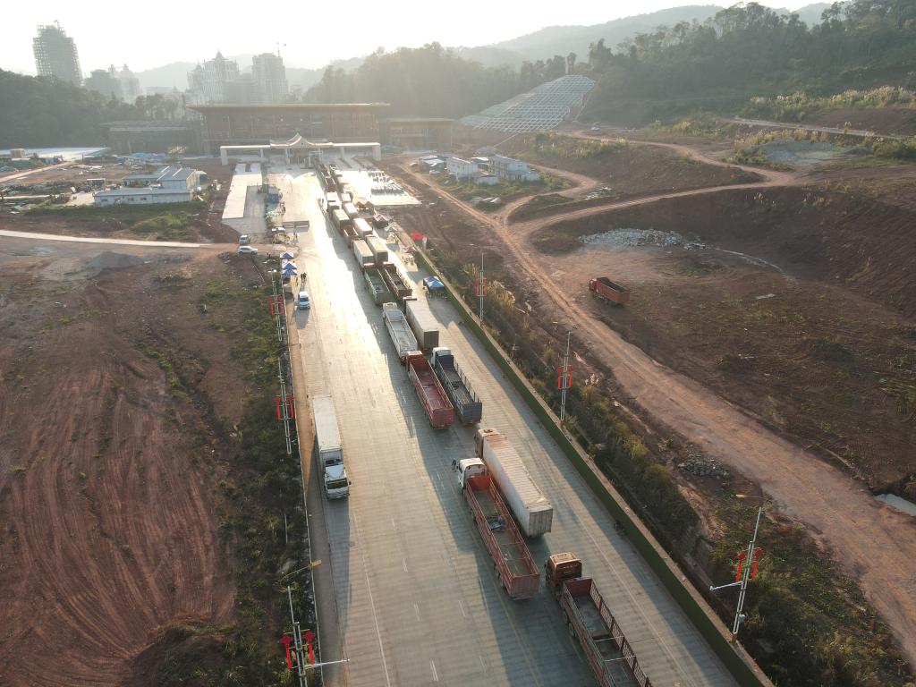磨憨口岸新建的联检大楼前,货车排队等着出关。新华社记者 浦超 摄