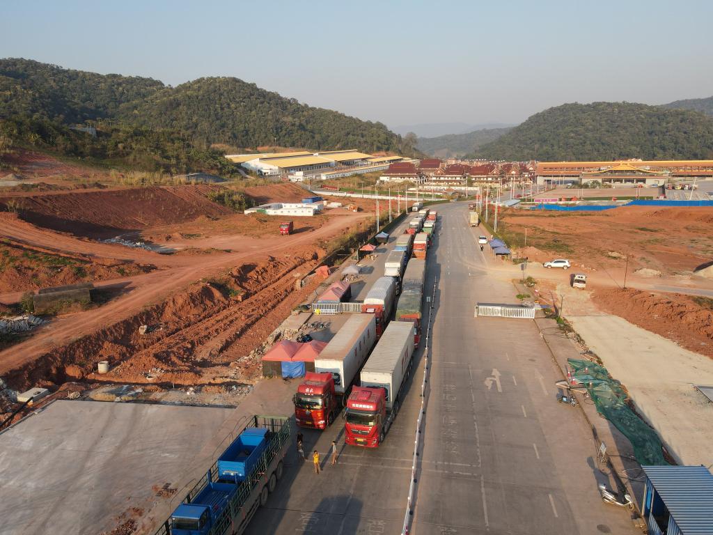 磨憨-磨丁经济合作区一角,货车排队等着出关。新华社记者 浦超 摄