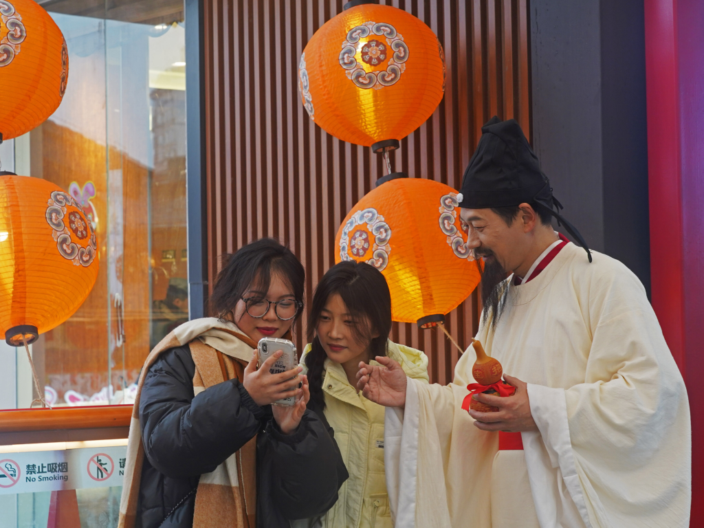 2月5日,在南昌市绳金塔历史文化街区,游客与角色扮演演员(右一)交流。新华社记者万象 摄