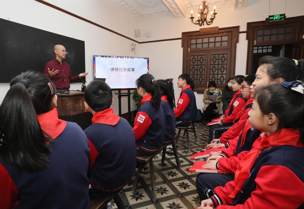 2月15日,在中国左翼作家联盟成立大会会址纪念馆,上海市演讲与口语传播研究会副会长兼秘书长林毅(左)为同学们讲解口语表达相关知识。新华社记者 方喆 摄