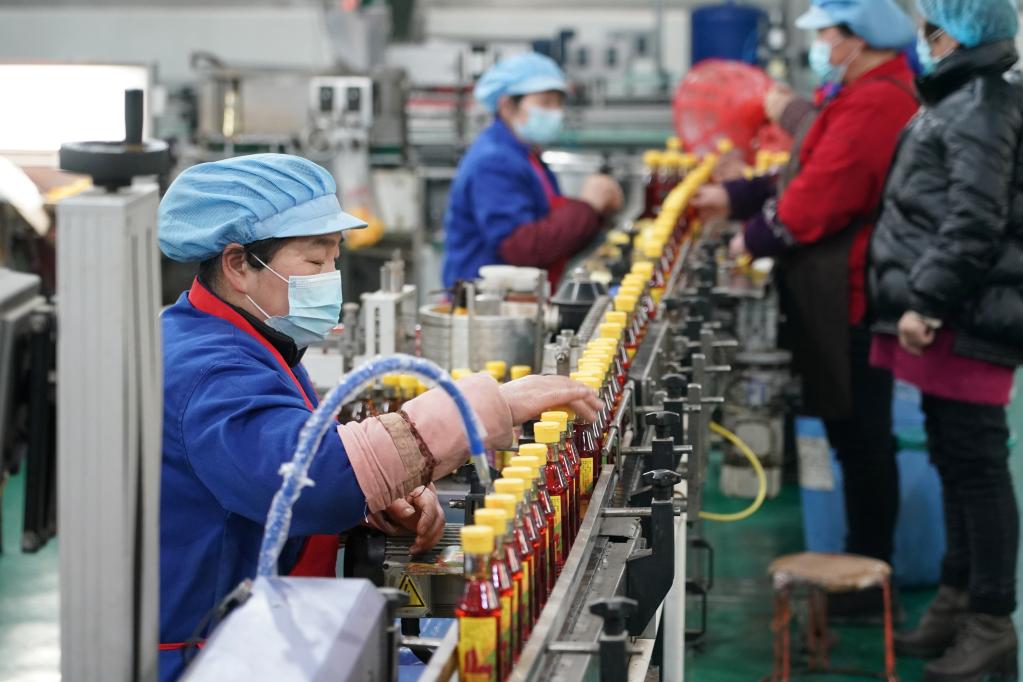 2月10日,陕西省三原县西阳镇一家香油企业的工人在车间包装线上工作。 新华社记者 邵瑞 摄