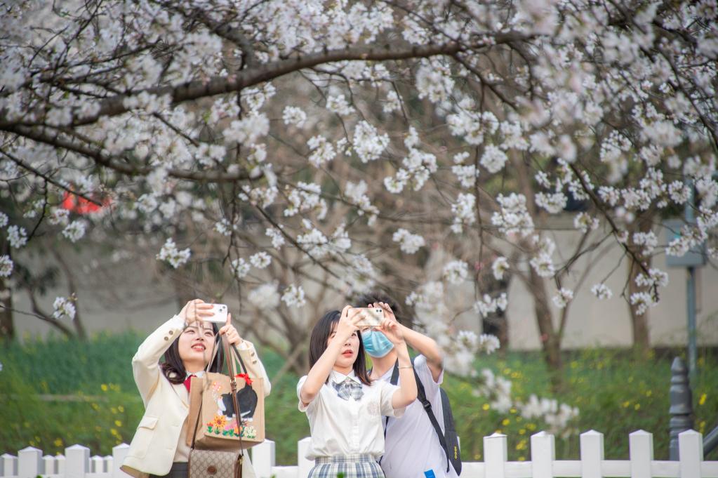 2022年3月14日,游客在武汉东湖樱园赏樱拍照。新华社记者伍志尊 摄