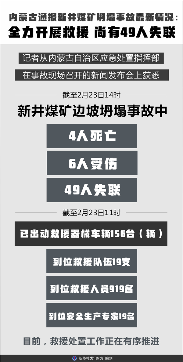 新华社呼和浩特2月23日电(记者王靖、安路蒙)记者23日从内蒙古自治区应急处置指挥部在事故现场召开的新闻发布会上获悉,截至2月23日14时,新井煤矿边坡坍塌事故中4人死亡,6人受伤,49人失联。