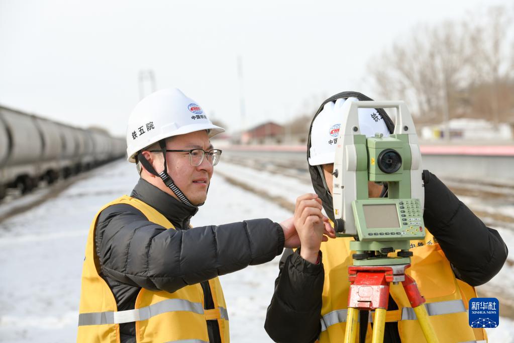 2月25日,黄腾(左)与同事在富锦火车站进行勘察测量作业。