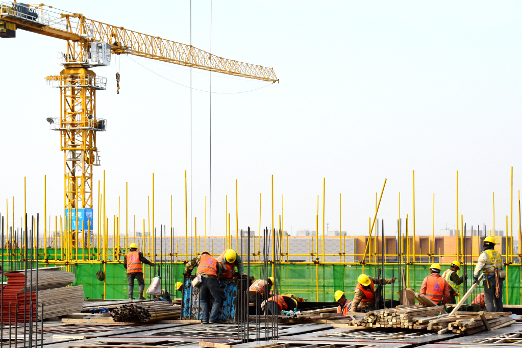 2月22日,济南国际标准地招商产业园基础设施二期项目4号厂房,工人正在为3楼顶板浇筑铺设模板。新华社记者陈灏 摄
