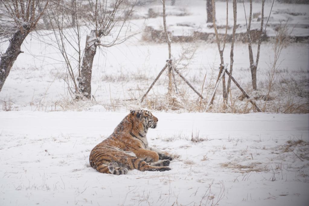 3月1日,黑龙江东北虎林园,东北虎在雪中小憩。新华社记者 戴锦镕 摄