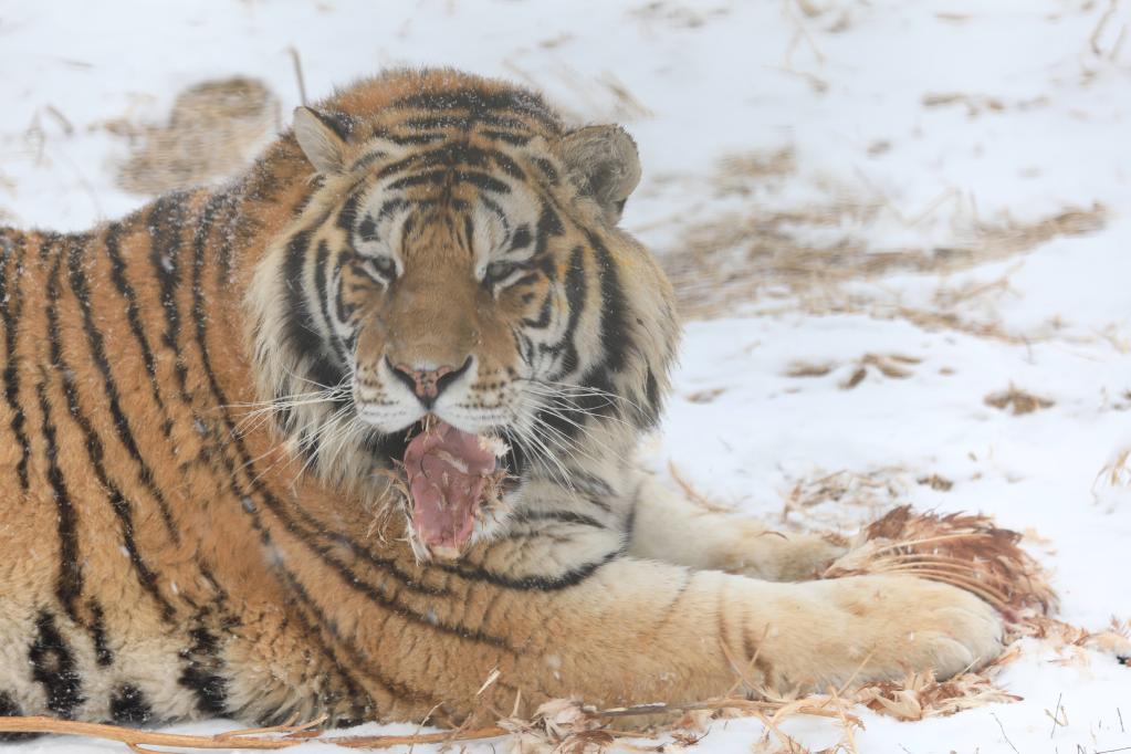 3月1日,黑龙江东北虎林园,东北虎正在进食。新华社记者 王大禹 摄
