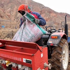 3月2日,在海东市民和回族土族自治县官亭镇鲍家村,农户正向农机添加化肥。新华社记者解统强 摄