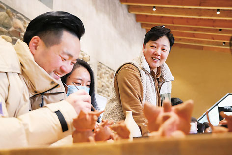 2月14日,清溪村青年返乡创业者刘芳(右)给游客上手工陶瓷课。黄云摄