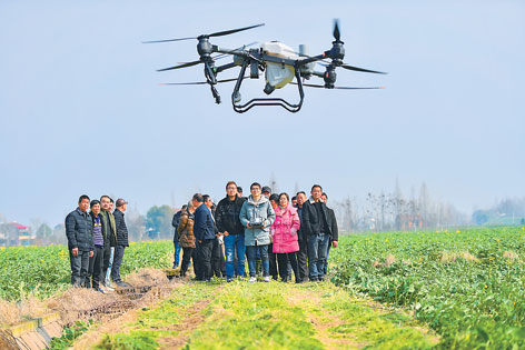 2月15日,在福安村油菜花田里,村民们观看无人机演示。新华每日电讯记者陈泽国摄