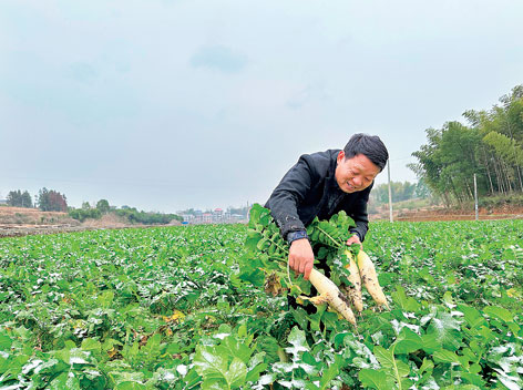 “老把式”阳加军如今也成了“萝卜老板”。去年春冬闲时,他组织村民在流转的500多亩土地上全播撒下萝卜种子。“一亩地产5000多斤,每斤均价保底能卖到5毛钱,效益好得很嘞。”阳加军乐呵呵地说。