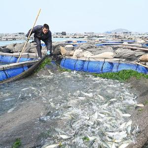 3月2日,渔民在东山县铜陵镇丰汇水产巴浪鱼优新品种推广示范基地捕捞巴浪鱼。新华社记者林善传 摄
