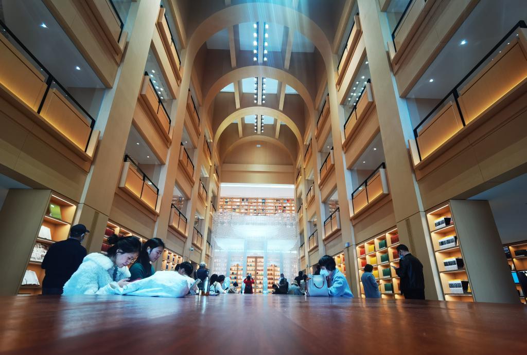 四川游客陈曦拖着行李箱来到书院,与原先匆匆“打卡”的计划不同,她停留了整个上午。“这像是一座博物馆、艺术馆,几处‘光盒空间’将海派建筑、徐家汇地区历史等主题书籍集中罗列出来,值得多花些时间好好阅读!”