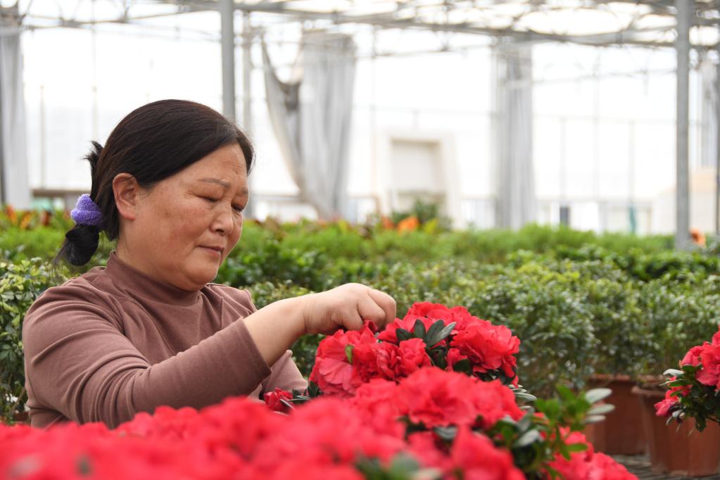 裕盛村村民正在大棚内整理花卉。新华社记者 张斌 摄