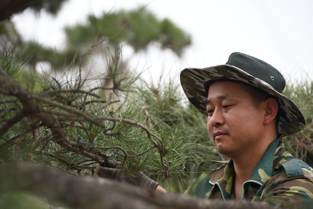 随着从产到销的链条逐渐完善,链条之上还连接着更多新兴职业。在另一个摊位前,27岁的李森正在对一株高约60厘米的高山黄杨进行造型,只见他用铁丝固定枝条,然后向一个方向扭转、压低,这株树苗顿时就增添了神韵,造型后的身价也从几百元升至上千元。