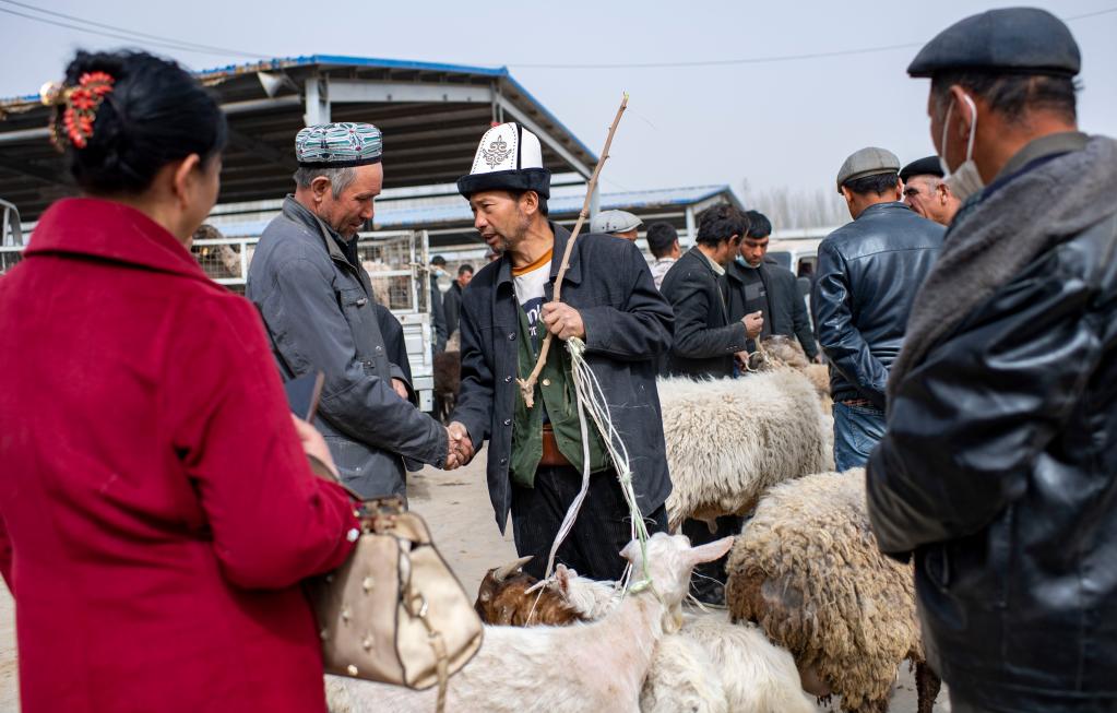 3月12日,买卖双方在新疆莎车县牛羊巴扎上握手议价。新华社记者 胡虎虎 摄