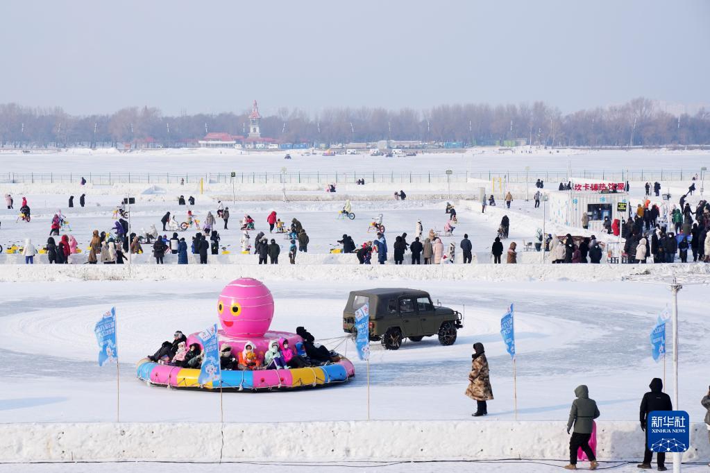 在黑龙江省哈尔滨松花江冰雪嘉年华园区,游客在体验冰雪娱乐项目(1月22日摄)。新华社记者 王建威 摄