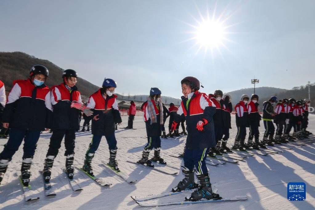 在吉林省吉林市万科松花湖度假区,吉化第九中学学生在滑雪体育课上练习(2月27日摄)。新华社记者 许畅 摄