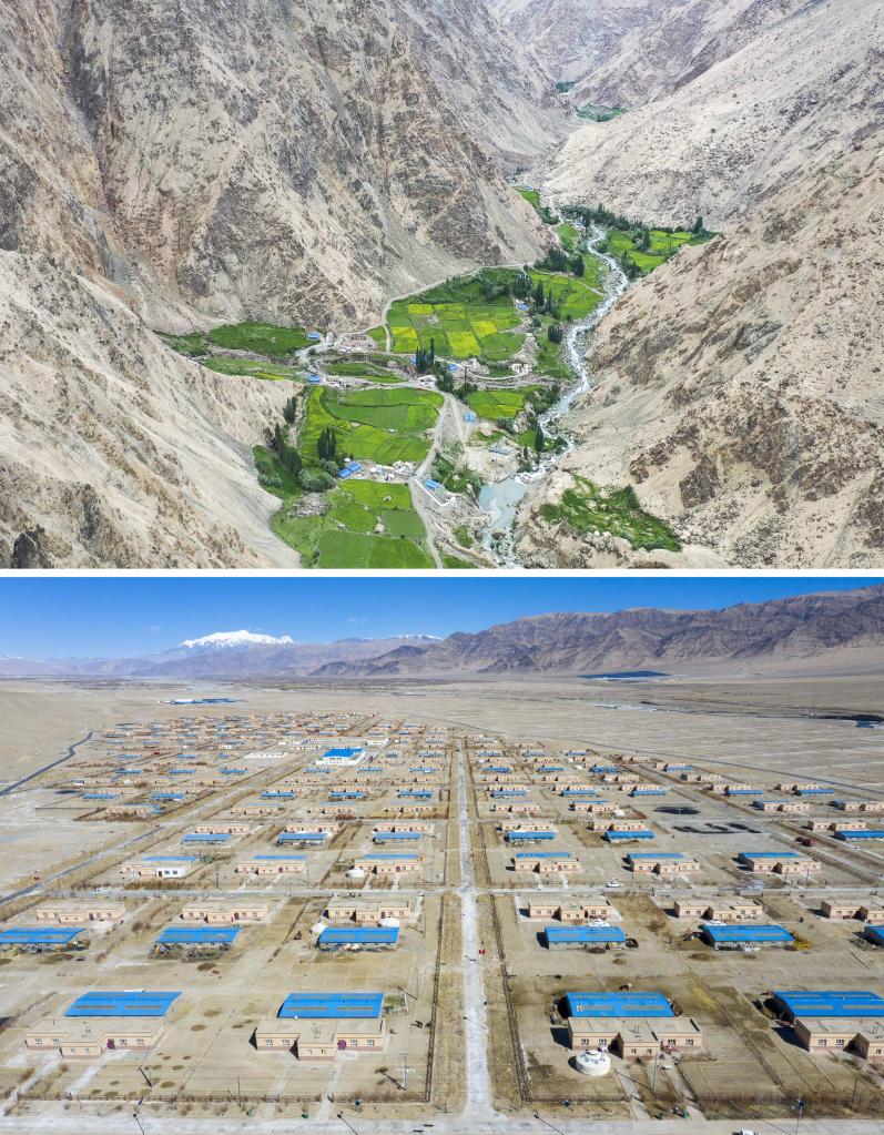 拼版照片:上图为古丽汗·赞加比力家易地扶贫搬迁前所住的马尔洋乡的山村一角(无人机照片,2019年6月28日摄);下图为古丽汗·赞加比力家搬迁后所在的富民村、爱民村(无人机照片,2023年3月17日摄)。