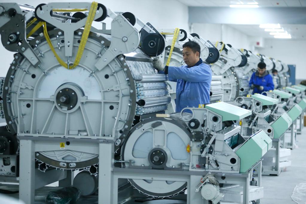 3月26日,工人在山东省青岛市即墨区即发龙山工业园的一处数字化纺纱智能工厂项目安装调试生产设备。该工厂投产后,将在生产全过程中应用大数据、人工智能、5G等信息技术,用工由原来的每万锭50人降为10人以下。新华社发(梁孝鹏 摄)